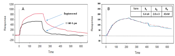上圖中,SH-EP1工程化細(xì)胞在細(xì)胞膜上表達(dá)α4β2受體,并結(jié)合初代抗體抗α4(右圖)。通過(guò)SPR 像圖所顯示的nAChR 同其初代抗體結(jié)合的分布(粉紅色),可以明顯看出這是一個(gè)非均相的表面結(jié)合。用SH-EP1野生型細(xì)胞來(lái)作為對(duì)照, 傳感曲線右下圖A顯示了兩種類(lèi)型的細(xì)胞對(duì)nAChR的反應(yīng)具有顯著差異。如傳感圖B中所示,從SH-EP1工程化細(xì)胞反應(yīng)減去野生型細(xì)胞反應(yīng)(主要出于體積折射率效應(yīng))給出nAChR與其第一抗體的結(jié)合動(dòng)力學(xué),kon =6×104/Ms,koff = 3×10-3/s 和KD=45nM。