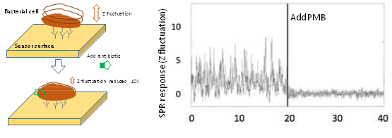 雖然明視場(chǎng)的細(xì)菌細(xì)胞像(小黑點(diǎn))穩(wěn)定,SPR像中的點(diǎn)波紋強(qiáng)度有著顯著的變化。通過(guò)監(jiān)測(cè)這些波紋在納米尺度下的強(qiáng)度波動(dòng),可為我們提供細(xì)菌細(xì)胞的新陳代謝的重要信息。當(dāng)將500μg/mL的殺菌性抗生素多粘菌素B(PMB)加入細(xì)胞室時(shí),細(xì)菌細(xì)胞的波動(dòng)急劇減弱(下右圖),從而表征細(xì)菌的死亡。