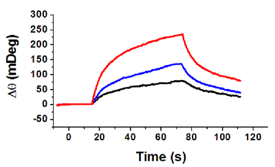 FIG. 2 Binding curves between pre-immobilized CD-14 protein and different concentrations of endotoxin: 20 ng/mL (red), 10 ng/mL (blue) and 5 ng/mL (black). A flow rate of 50 μL/min was used.