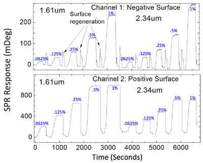The sensitivity of the method depends on the particle size and concentration (FIG. 2). Smaller particles are, in general, more sensitive than larger particles. However, if the particles are smaller than ~1 μm, then Brownian motion becomes important, which changes the relatively simple relation between SPR response and surface charge density. Higher particle concentrations are also more sensitive, but the upper limit is determined by the full coverage of the surface with particles. The particles demonstrated in this work were negatively charged silica particles, which acted as probes and amplifiers for sensitive detection of surface charge density. Other micro- and nano-objects, insulating, semiconducting or metallic, may also be used as probes, as long as their optical properties are different from that of the buffer solution. Finally, it is important to point out that the method can, in principle, determine the charge of micro- and nano-scale objects if the surface charge of the sensor is known or calibrated.