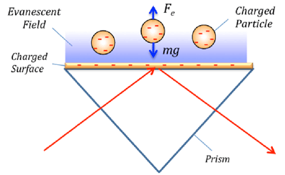 FIG. 1 The equilibrium distance between a charged particle and charged surface is determined by the balance between the electrostatic force and gravity on the particle, which depends on the surface charge density. SPR can accurately measure the equilibrium distance, thus the surface charge density.