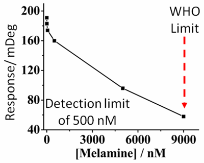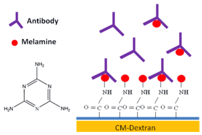 In 2008, the illegal adulteration of infant milk products with melamine (structure shown in FIG 1) led to an outbreak of adverse kidney and urinary effects in thousands of children in China.[1] Clandestine addition of melamine in milk products was to boost the detectable protein contents. Because of the severe impact of melamine on human health, the World Health Organization (WHO) has mandated that melamine in infant milk powder and in feedstock not to exceed 1 mg/kg and 2.5 mg/kg, respectively.[2] The scheme in FIG 1 illustrates an SPR assay for Melamine detection reported by Fodey et al. [3] An amine-modified melamine analog is immobilized onto a carboxymethyl dextran chip, which produces an SPR response when the polyclonal melamine antibody is injected into the SPR flow cell. The presence of melamine in solution will decrease the SPR signal, as it competes for the antibody molecules pre-added into the sample solution.