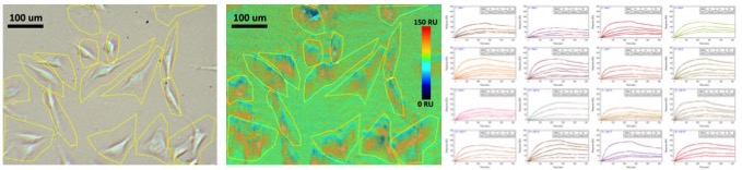 Figure 2. SH-EP1 cell to WGA protein interaction. From left to right: (1) optical image of SH-EP1 cells (2) SPR intensity map of SH-EP1 and WGA interaction, (3) SPR kinetic binding responses of 16 selected cells to five different concentrations of WGA.